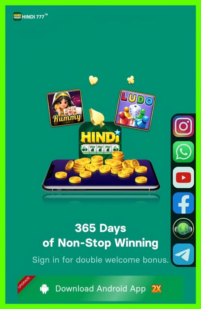⭐ Hindi 777 App – ₹51/₹100 बोनस | फ़्री डाउनलोड 2025रम्मी खेलें • असली पैसे जीतें • 10 मिनट में पेमेंटHindi 777 App भारत का एक लोकप्रिय रियल-कैश रम्मी प्लेटफ़ॉर्म है, जहाँ आप क्लासिक 13-कार्ड रम्मी, तेज़ गेमप्ले और रोमांचक टूर्नामेंट का मज़ा ले सकते हैं। नए यूज़र्स को मिलता है ₹51 या ₹100 का इंस्टेंट साइन-अप बोनस, और कमाई को आप सिर्फ़ 10 मिनट में निकाल सकते हैं।🔥 Hindi 777 App की खास बातें✔ साइन-अप पर तुरंत ₹51/₹100 बोनस✔ बड़ी कमाई का मौका – ₹1 लाख से ₹10 लाख तक विजेता✔ तेज़ पेमेंट – UPI/बैंक में 10 मिनट में withdrawal✔ 100% सुरक्षित प्लेटफ़ॉर्म – सुरक्षित पेमेंट और विश्वसनीय सिस्टम✔ शानदार UI – नए खिलाड़ियों के लिए भी आसान✔ 24×7 कस्टमर सपोर्ट✔ कई गेम्स – रम्मी, Teen Patti, Andar Bahar और बहुत कुछ🎮 गेम की विशेषताएँक्लासिक 13-कार्ड इंडियन रम्मीपॉइंट्स रम्मी, डील्स रम्मी, पूल रम्मीअसली खिलाड़ियों के साथ लाइव मैचस्मार्ट मैचमेकिंग और एंटी-फ्रॉड सिस्टमहल्का, फास्ट और स्मूथ एंड्रॉयड APK💰 Refer & Earnदोस्तों को आमंत्रित करें और अनलिमिटेड रेफरल बोनस कमाएँ।जितना ज्यादा वे खेलेंगे — उतनी ज्यादा आपकी कमाई!📥 Hindi 777 App डाउनलोड (2025)फ़्री APK डाउनलोडकोई रजिस्ट्रेशन फीस नहीं